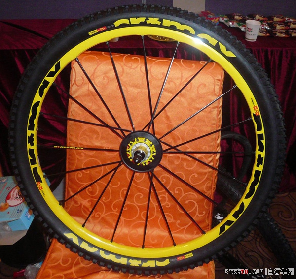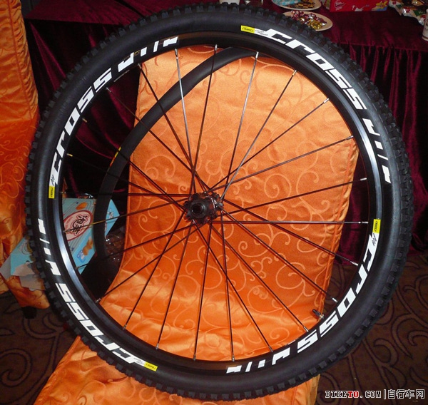 在山地轮组方向,MAVIC推广WTS系统,也就是山地一体式圈胎系统,充分考虑了前后轮不同的特性,前轮圈和胎更宽,增强抓地力,后轮圈和胎更窄,强调牵引力和滚阻。这是CROSSMAX ENDURO,非常亮骚的黄色,这是为现在很火热的耐力赛(ENDURO)准备的一体式圈胎系统,这个轮组是MAVIC和世界上骑得最快的耐力赛选手共同开发的,因此带有SSC标记,独特的性能让它具备了良好的贴地性和操控反应,展出的这对是27.5英寸规格。一对轮组重量是1660克,WTS圈胎一起是3460克,MAVIC的轮胎全部是法国原产,这些高性能的轮胎都有零售。