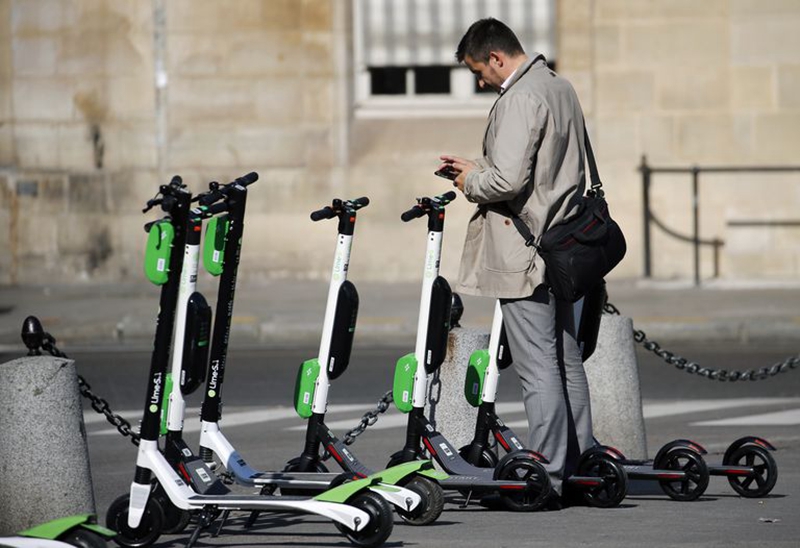 ▲巴黎街头,一名男子骑着一辆Lime电动滑板车