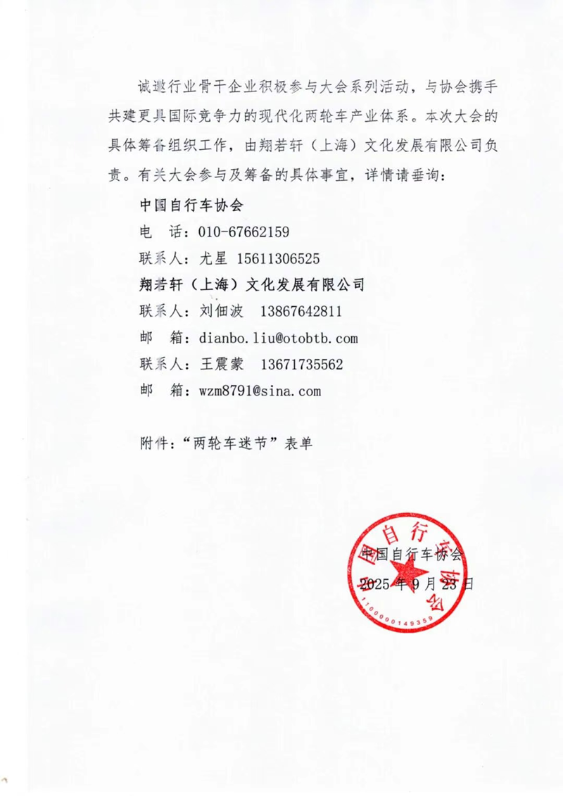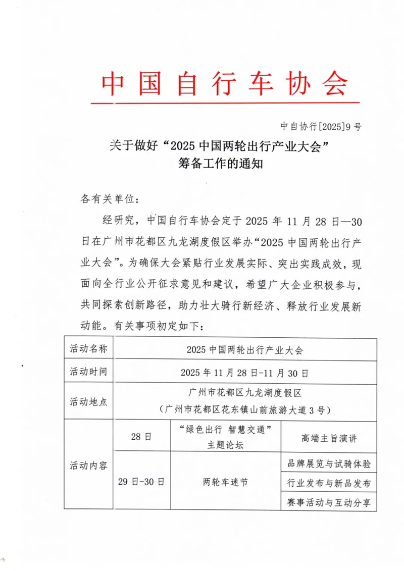 中国自行车协会发布关于做好“2025中国两轮出行产业大会”筹备工作的通知。中国自行车协会定于2025年11月28日-30日在广州市花都区九龙湖度假区举办“2025中国两轮出行产业大会”。为确保大会紧贴行业发展实际、突出实践成效,现面向全行业公开征求意见和建议,希望广大企业积极参与,共同探索创新路径,助力壮大骑行新经济、释放行业发展新动能。
