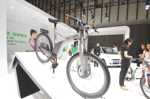 自行车能给手机充电?是的。会场上,奔驰Smart推出的新款E-bike以新奇的创意吸引众多观众的眼球。