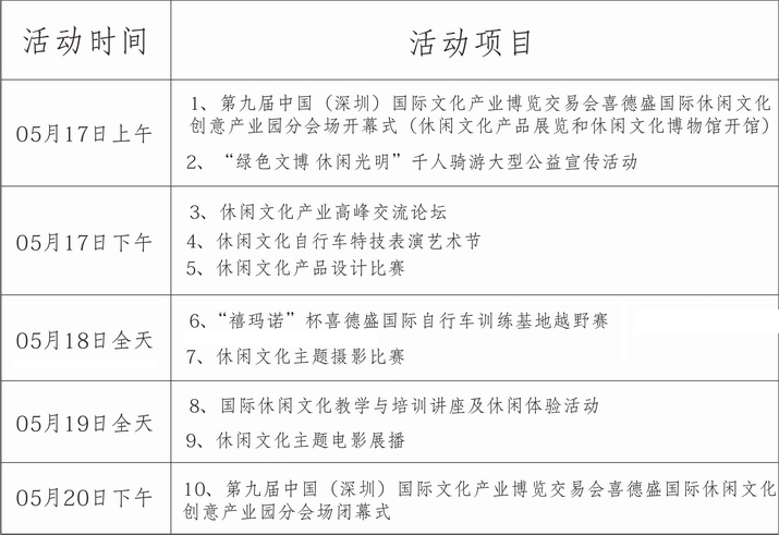 为借助文博会平台,进一步创新和推动休闲文化产业的进一步发展,喜德盛国际休闲文化创意产业园将在文博会期间开展一系列特色休闲文化主题活动。