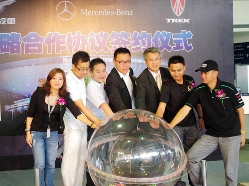 8月11日,上海平治奔驰4S店在位于真北路3251号的展厅与美国崔克自行车公司TREK车队在举行签约仪式,确立正式战略合作伙伴关系,现场还交付了奔驰唯雅诺以及崔克自行车新车型。