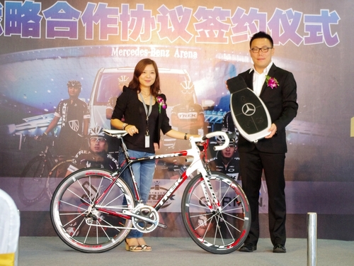 在本次的签约合作中,上海平治奔驰向崔克TREK中国自行车车队赠予一台奔驰唯雅诺比赛用车;同时,崔克中国也向上海平治奔驰赠予了崔克自行车一辆。