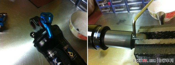 然后用4mm的六角匙扭松将IFP气室的气体放掉。必须将两个气室的气体放掉后,方可扭出顶盖,因为里面的压力为未知数,不然会有可能在瞬间炸开。拿掉气室缸体之后的避震总成。以防万一,将气缸活塞上的一个六角螺丝松掉一点。用扳手将活塞扭开,开拆之后会发现油缸里的油都基本漏光了,只见一个白色的IFP活塞顶了上来。用台钳将活塞总成加起来,用10mm的扳手将末端的螺母扭出来,卸下阻尼调节阀及气阀。卸下卸下阻尼调节阀及气阀之后会看到调节踩踏平台的顶针,3段的踩踏平台就由它来控制开阀的力量,这条短小的弹簧有着决定性的作用,弹簧越硬,踩踏平台越坚挺。