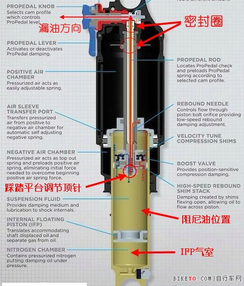有很都车友在使用的过程当中发现在调节阻尼旋钮的位置出油特别厉害,就算在不使用的时候,拨杆位置仍然出油凶猛,一滴一滴的出油。在使用的时候发现阻尼调节失效,3段的踩踏平台调节感觉消失不见。这个时候就要考虑进行维护维修了,经过我多番研究发现,其实漏油的原理以及修复很简单,不过要复原的过程却相对比较困难。