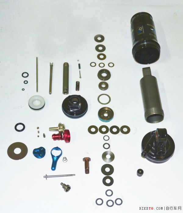卸下阻尼杆的调节总成会发现,共有3杆2节点,在我以往修理漏油的RP23漏油的原因多数是踩踏平台调节杆与阻尼调节杆之间的油封破损而导致的漏油事故,因为此处基本是RP23避震内部结构的末端油封与外界接触最多的油封;泥沙、水等的外部物体可通过外部蓝色拨杆及红色阻尼调节旋钮进入内部接触这个油封,长期的油量流失以及水、泥沙的摩擦从而导致油封的磨损破坏,最终成就了漏油的事故。