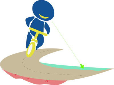把外侧脚放低能提高轮胎的抓地力,身体整体的重心也较低一些,也较容易抓到平衡点,而同时内侧脚也因而抬高,避免踏板去卡到地形的突出物。在路面崎岖的弯道上,记得让身体有更大的空间去吸收路面的障碍,不要把内侧脚放在下面