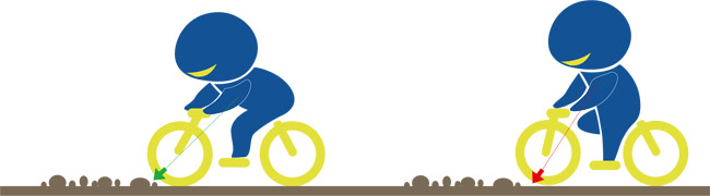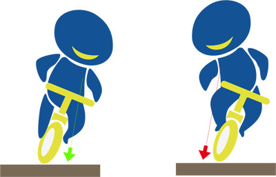 拉动刹车时,由你心脏-头的这条线会向前移-就像一根绑着纺锤的绳子。如果这条线投射到地面的点超过前轮的接地点,你的身体会被向前拉引接着发射出去。用力刹车就好比撞上一颗大石头-刹车力道太大会导致你的重心被向前抛,越过你能保持平衡的临界点。刹车跟撞击障碍物是相同的,你的重心必须保持在前轮接地点的后方