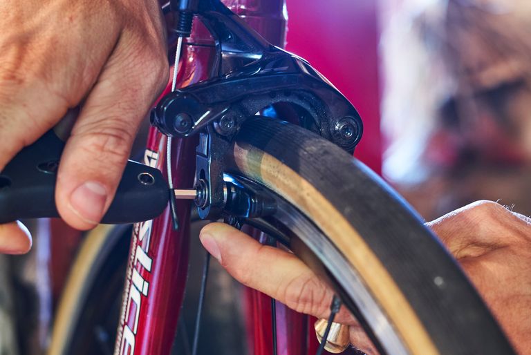 转动夹器上的调节螺丝,刹车片即可移入移出。检查所有的四个刹车片,如果已经将凹槽磨损,则应该尽快更换。确保四个刹车片都能够贴紧轮圈,否则需要使用六角扳手拧松并重新调整。当捏下刹车后,刹车块应该贴紧轮圈,如果只有一边贴紧轮圈,则需要旋转,直到两边均离轮圈相同距离(1/4-1/8英寸,约6-12毫米)。
