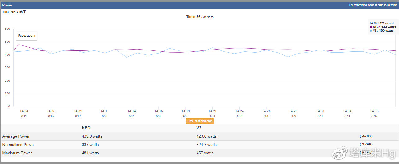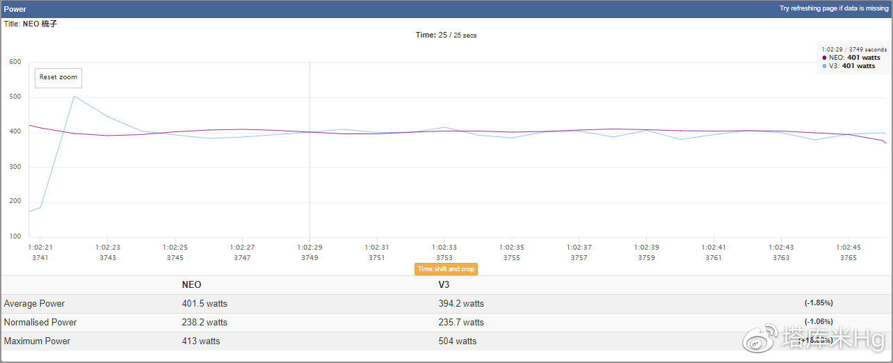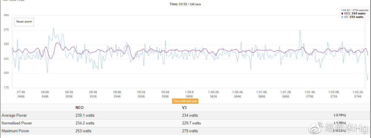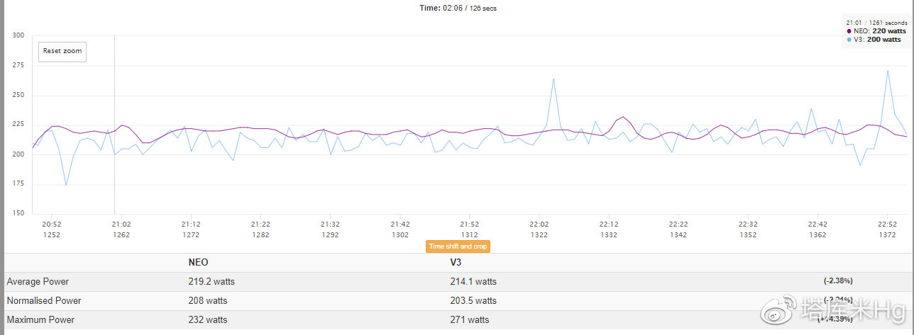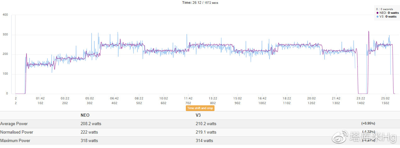 截取出第一段五分钟左右的功率,可以看到NEO和V3有着高度的一致性,两者无论是NP还是AP差值都在1%以内,锁踏对于极值的功率更加敏感,所以最高和最低功率都超出NEO。