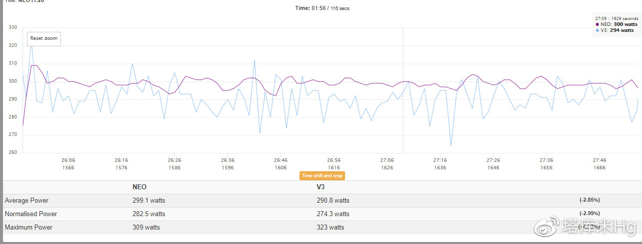 ▲截取2分钟300w左右的功率段,这次的偏差值稍微大一点,在3%以内,还算能够接受,可以看到V3的数据没有NEO稳定,变化更加敏感。
