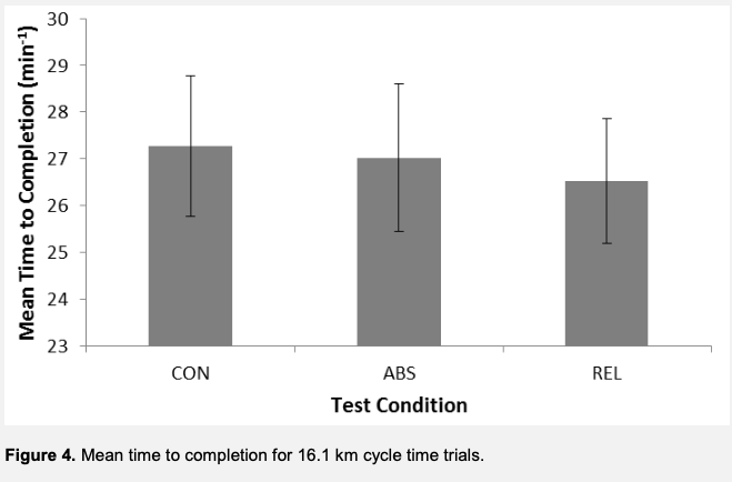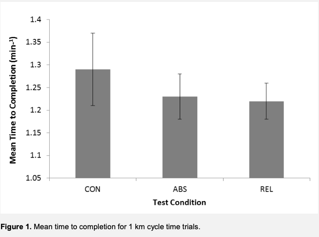 1公里计时赛统计表明,按照条件,对完成1公里计时赛时间没有显著影响,然而,摄入符合补给品可以减少时间。完成1km的平均时间为,CON 1.29±0.08 min、ABS为1.23±0.05 min, REL为1.22±0.04 min。