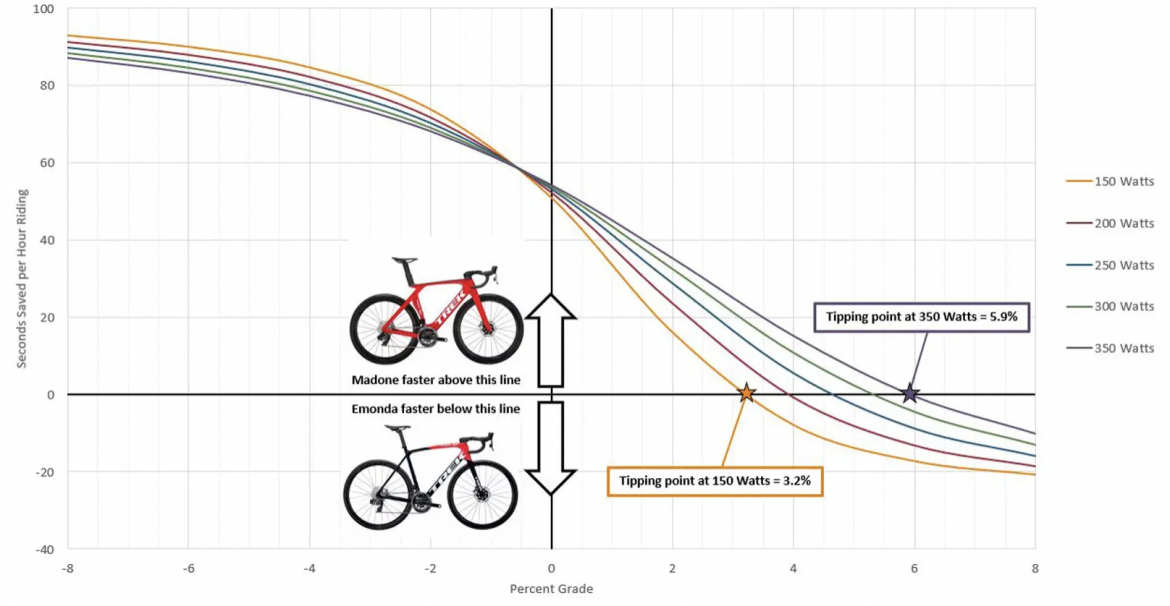 我们就用自家的2021款轻量爬坡公路车Emonda与2023款气动型公路车Madone进行对比。上图显示,在无风的环境下,体重73公斤、输出功率150W车手的骑行下,Emonda要比Madone更快的坡度临界点在3%至6%之间。