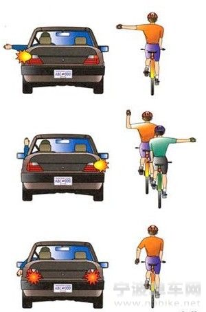 5.转向:左手或右手平举,表示改变骑行方向。左手说明左转,右手反之。