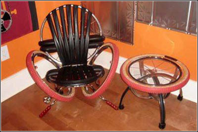 这是由自行车做成的椅子和茶桌组合,摆在房间里很有创意吧