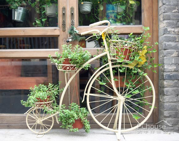 自行车花架,把植物的错落感,展现出来。茂盛的植物绕满车轮,英式的田园和浪漫。