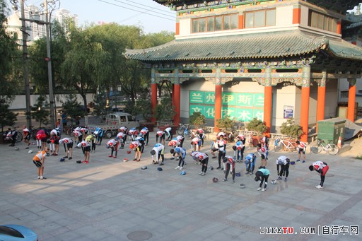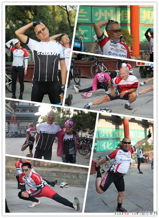 兰州的清晨,太阳已经高挂。强烈的阳光照射在窗前,唤醒了蓄势待发的勇士们。六点半,车友们便集中在白云酒店的门口,开始为第一天的丝路骑行做热身运动。