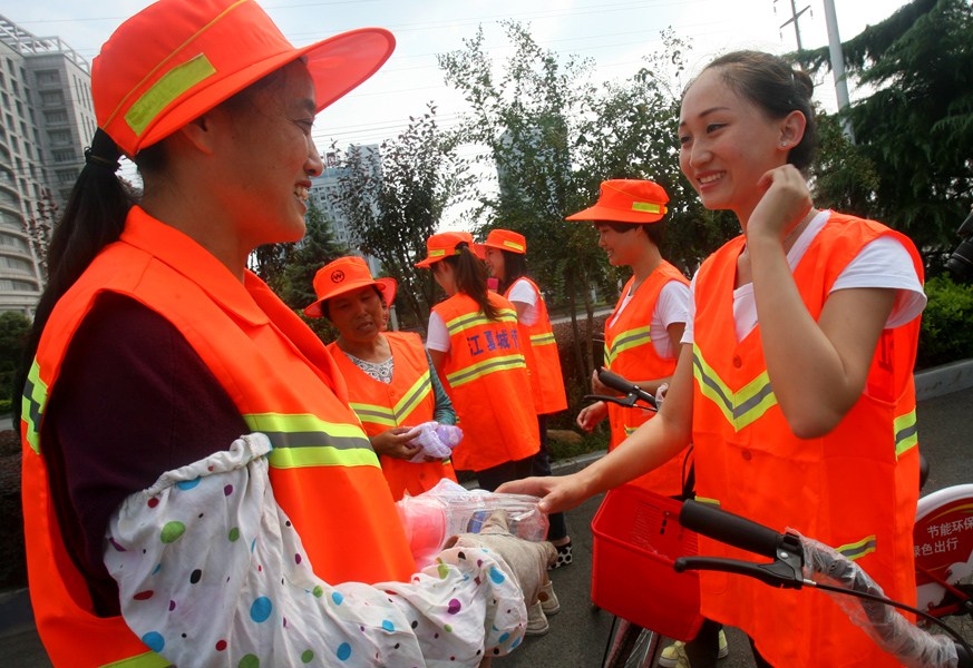 武汉江夏区聘请美女组团骑自行车参与城管执法,微笑劝说占道经营者,并帮忙搬运物品。据说这次活动是想动员市民爱护身边环境。9月24日下午,武汉江夏区,20名身材高挑,长相甜美的年轻女孩身,着统一T恤、牛仔长裤、白色板鞋,骑着便民自行车出现在江夏街头,与江夏区城管执法队员参与巡逻,微笑劝说占道经营户并帮忙搬物品。