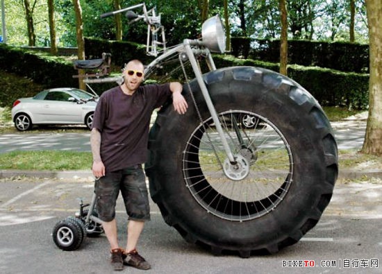 来自荷兰的艺术专业学生、曾做过机械工程师的沃特·梵登布希花了三个月时间制造出一辆巨型自行车。据悉,此车由沃特收集来的钢管、自行车组件和拖拉机轮胎等拼装而成。而沃特本人也一炮走红:他骑在该自行车上的视频被放在Youtube视频网站上后,两周内点击次数超过60万次。
