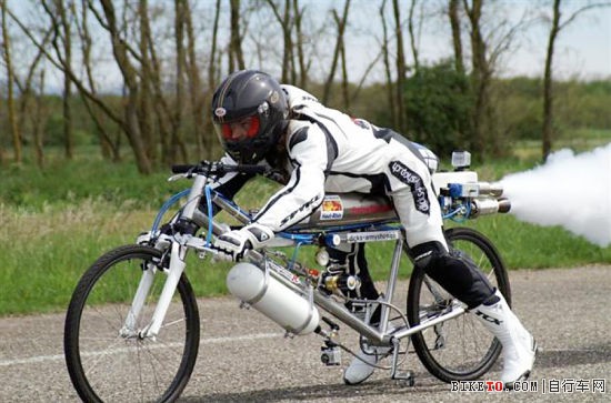2013年6月,英国水管工科林·弗兹(Colin Furze)将喷气式发动机安装在自行车上,并调整自行车的框架,增加其长度,以免喷出的火焰灼伤骑车者。这辆自行车行驶速度可达每小时50英里(约80千米)。但由于这辆自行车未安装任何安全保护措施,因此它成为世界上危险系数最高的自行车。