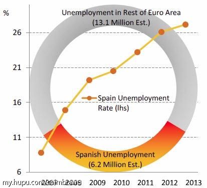 关于西班牙经济,有司空见惯的人也会说即使在以前经济好的年景,西班牙的失业率也不低,但是西班牙自从上世纪八十年代经济腾飞以来,主要的经济引擎就是旅游、少量的制造业和房地产。在房地产复苏遥遥无期的情况下,政府的财政收入势必依然会继续下降,而制造业中政府节流开源,加大税收的情况下,情况依旧不乐观。更不用说经济命脉银行业的咽喉也被房地产和对葡萄牙债务的敞口所扼住(事实上,正是由于对希腊主权债务的敞口导致了塞浦路斯银行体系的崩盘),如果葡萄牙的经济、债务继续恶化,非常有可能发生连锁反应,波及到西班牙的众多银行,从而牵一发而动全身,引爆西班牙全国的债务危机。