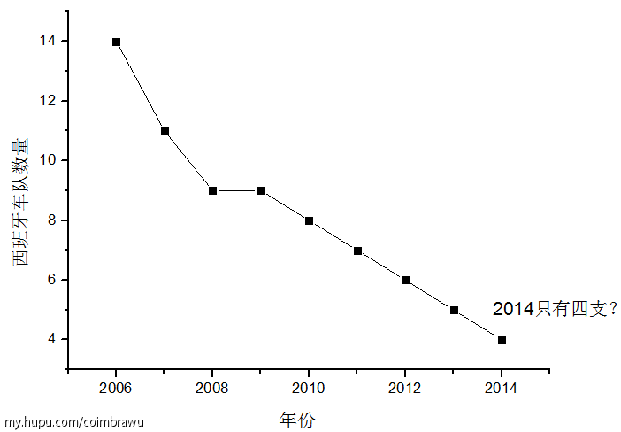 对于西班牙自行车来说,更为可怕的一个数字,是注册在西班牙的车队数量。算上世巡赛车队(ProTour Team),洲际职业车队和洲际车队,2013年,西班牙注册的车队仅有5支!2012年,这一数字为6支;2011年,7支;2010年,8支;2008年,9支;2007年,11支;2006年,14支。这一组数字意味着,自从2007年的欧债危机爆发以来,几乎每一年,西班牙都会有一支车队最后消失!