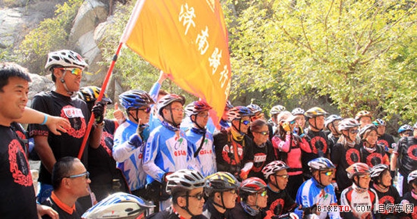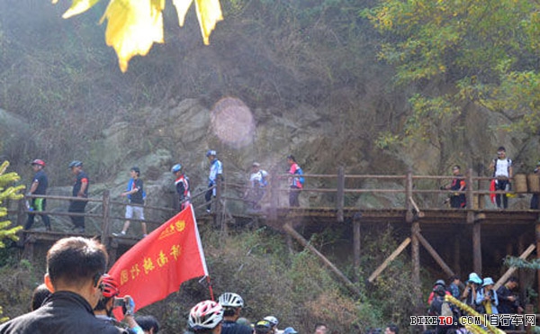 启动仪式结束后,济南骑行团成员在景区工作人员指引下前往就餐,随后进入2个小时的自由活动时间。枫叶霜红,栈桥盘山,一汪碧水,早让骑行队员们按捺不住登高的心情,午餐大家尽快解决后就继续开始了向上攀登。登山途中,队员统一的服装标示、健康积极的精神风貌让重阳节前来登高祈福的人们驻足围观。当得知队伍中有60岁骑行队员的时候,人群中不少人都暗自赞叹。随队跟拍的“鸿雁”老师不无羡慕的告诉工作人员:“刚才发现队伍中有女骑行队员,一路跟着大部队走,真了不起。本来还以为人家挺年轻,一问,人家儿子都十多岁了,骑行活动真是让人有活力。”