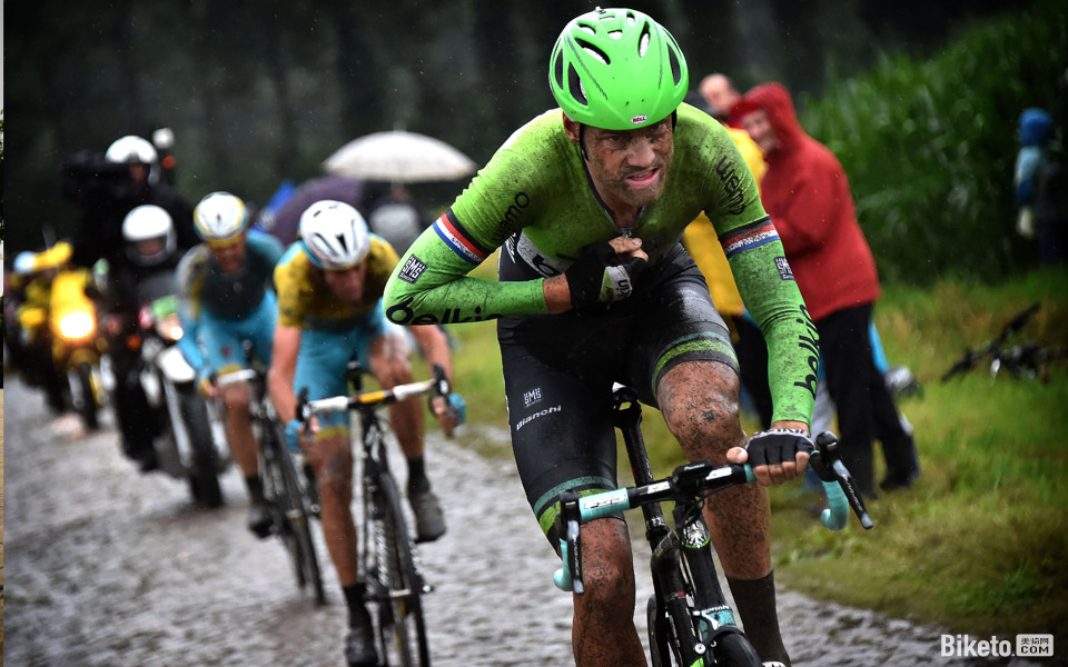 2014年7月9日,环法迎来了第一周的焦点大战——穷人版巴黎-鲁贝赛段。本赛段原定包含9段,合计15.4公里的石头路;然而今天法国北部普降大雨,路面积水严重,组委会也临时将其中2段石头路(第五段和第七段)取消。(图片由禧玛诺提供)