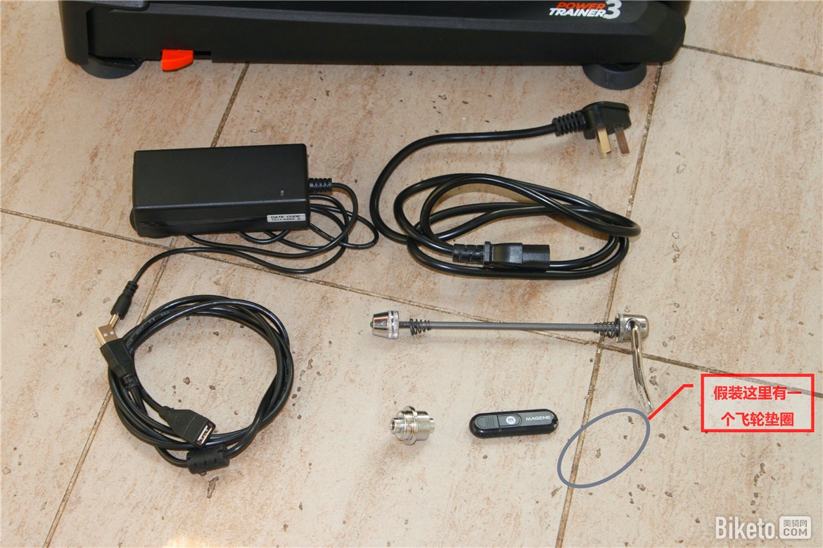 开箱我没有拍照,不过配件还是比较齐全的,除了台子本体之外,电源线、10速飞轮垫片、130/135开档转换轴心、快拆杆、ANT+接收器以及USB延长线一应俱全,这些和上一代作品是相同的。