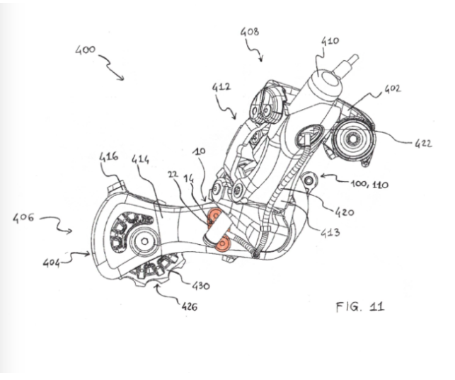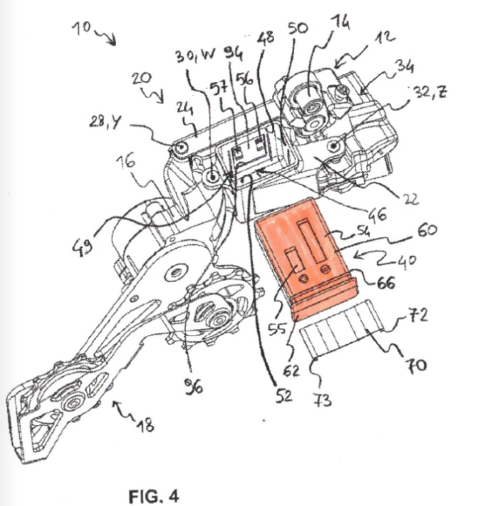 CP的专利申请涵盖了包括无线功能在内的多种不同的后拨配置。比如名为“Bicycle Electric Rear Derailleur”的专利申请显示了CP带有一体式可拆卸充电电池组的后拨。电池可以用来驱动后拨,也可以进行无线通信,比如蓝牙功能。
