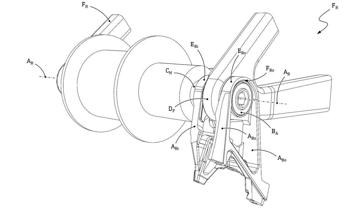 SRAM公布的专利展示了一些可以单独更换的修补件,AXS后拨有一个可更换的核心变速组件,其中还有可更换的更小的零件。SRAM的直装后拨可能正在摆脱传统的尾钩设计,但看起来可更换式的直装一体尾钩仍然存在,看起来更像夹在车架上的一体尾钩(Abi或ABo),以及一个将它们固定在一起并用作悬挂下方实际后拨的基础固定板(HG)。