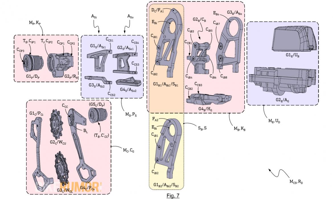 SRAM于2022年12月29日发布的最新专利描述了一种模块化变速器结构,该结构由几个不同的模块组成,每个模块都应该能够单独更换:“基本元件模块”、“旋转结构模块”、“换档元件模块”和“导链模块”。变速器采用模块化设计并不是革命性的,但专利中的这一声明特别有趣: