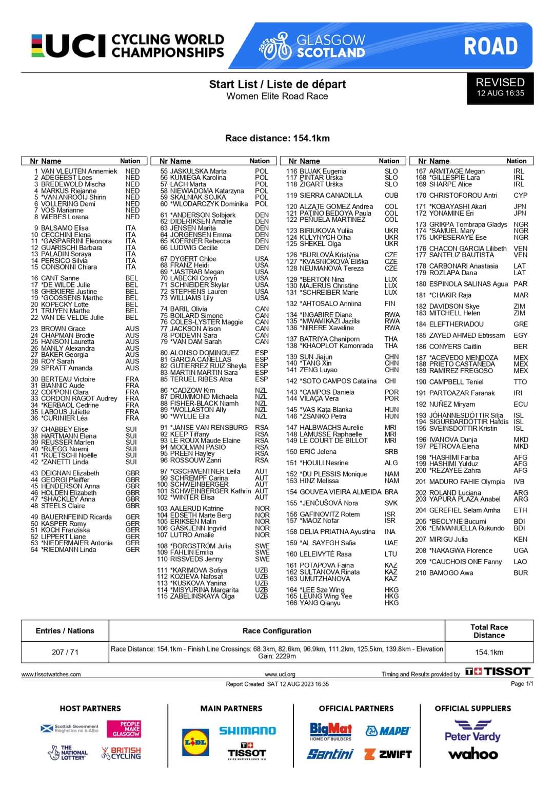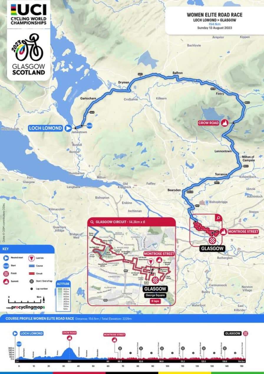 赛事路线。本场比赛赛程154公里,从洛蒙德湖畔出发,途径克罗大道山南下来到格拉斯哥城区进行绕圈,每圈14公里,共6圈,率先冲线的选手获得冠军。中国队派出孙佳君(139号)、唐欣(140号)、曾璐瑶(141号)参赛。