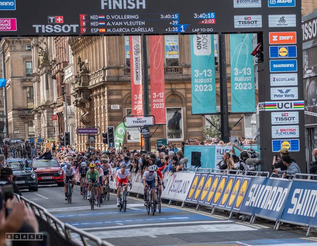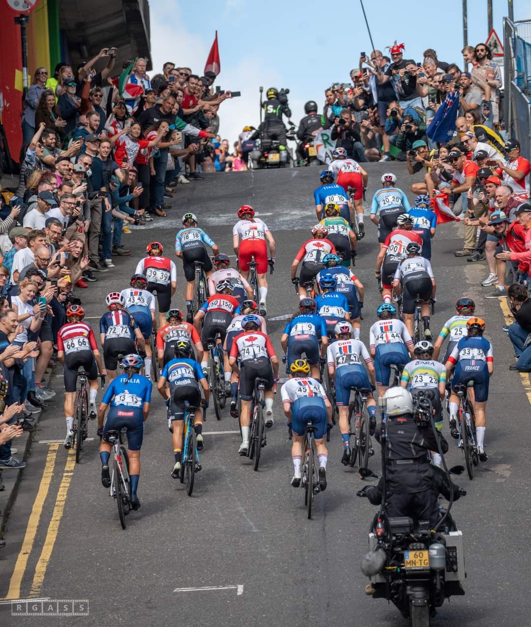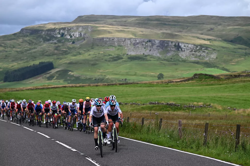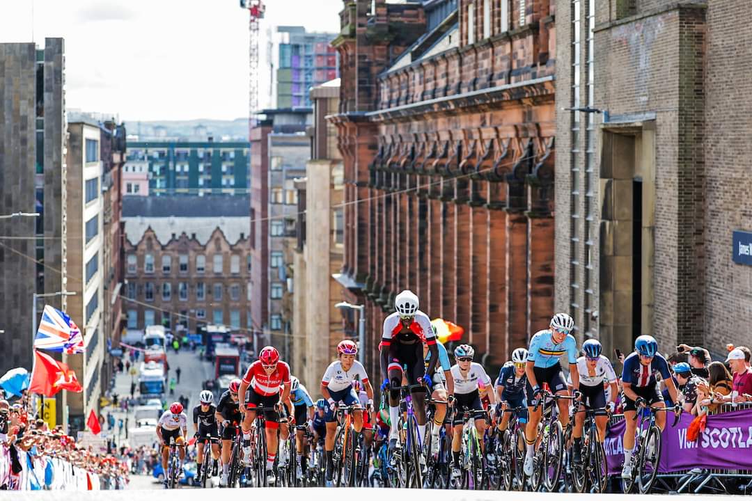 大集团在爬山途中拉扯,部分爬坡能力较弱的选手掉队,一旦触发强制淘汰规则(选手落后主集团12%时间,约2分钟)上收容车,原本200人大集团在爬山到格拉斯哥市区途中约40名选手陆续上收容车。大集团待进入格拉斯哥市区绕圈后,她们逐渐追上先前突围选手,但此时大集团被弯多、路陡的市区绕圈拉扯成多股小队,部分体力较弱的选手陆陆续续被淘汰上收容车,其中包括中国队主将孙佳君和副将唐欣。