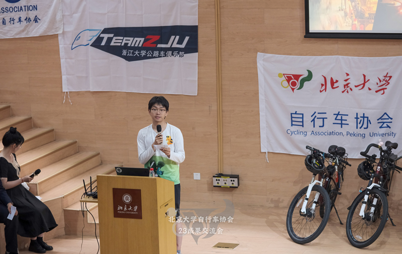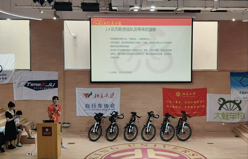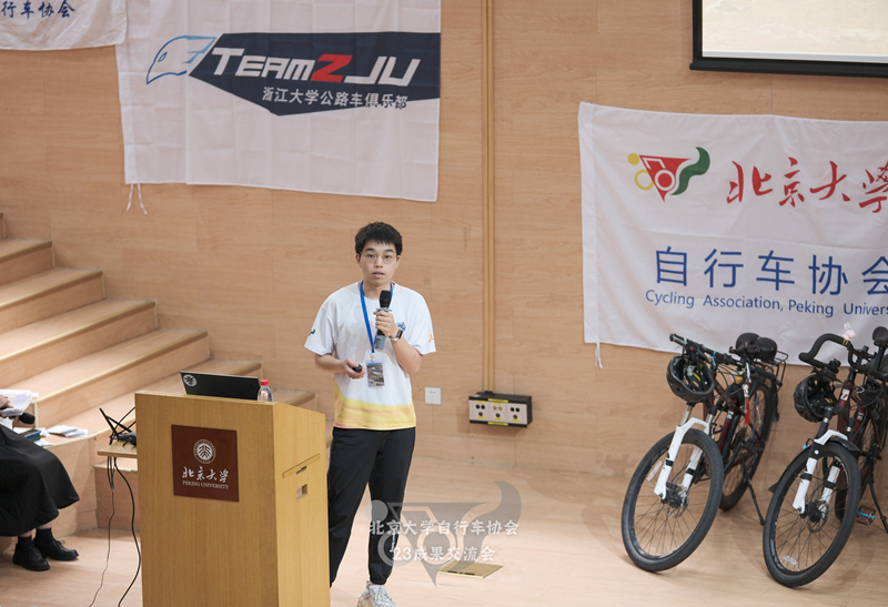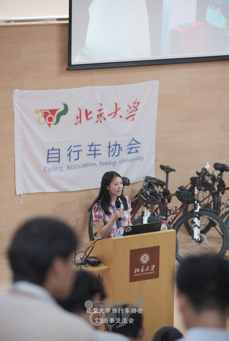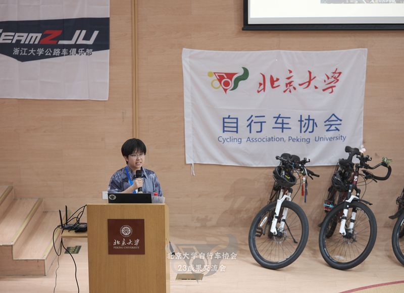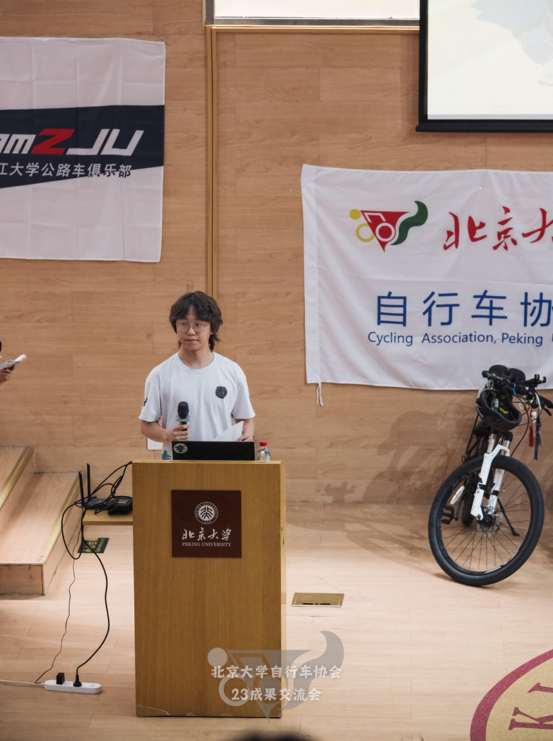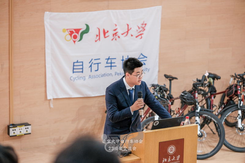 随后到来的是交流赛宣讲,北大车协第十七届全国高校自行车交流赛总负责王玮从交流赛历史讲起,重现了交流赛近30年来走过的历程,特别是第一届交流赛和18年比赛规格创新高以及之后由于疫情等各种原因而受挫的故事。随后从对于协会发展传承的意义出发,指出交流赛的意义即交流赛是协会最大的财富和最大的支柱,同时对于会员能力培养也是帮助极大。最后她讲述了筹备组织架构,交流赛筹备过程和遇到的挫折,最后交流赛的成功举办也让各大高校的车协有了共同珍藏的回忆。