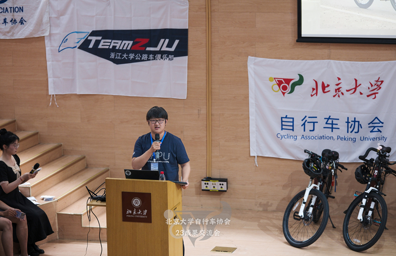 除了北大车协的经验外,中国农业大学阳光车协负责人赖世宣也分享了农大车协的经验。他介绍了农大车协活动的基本情况:每周一三五的晚训,周末在北京的骑游与夜游,暑期远征与冬训等等。他还特别介绍了日常拉练的基本模式,特别提到了与北大车协不太相同的队列骑行模式。他也分享了中农车协设置的职务职责和在协会感到的温暖点滴,引起了车协人的共鸣。