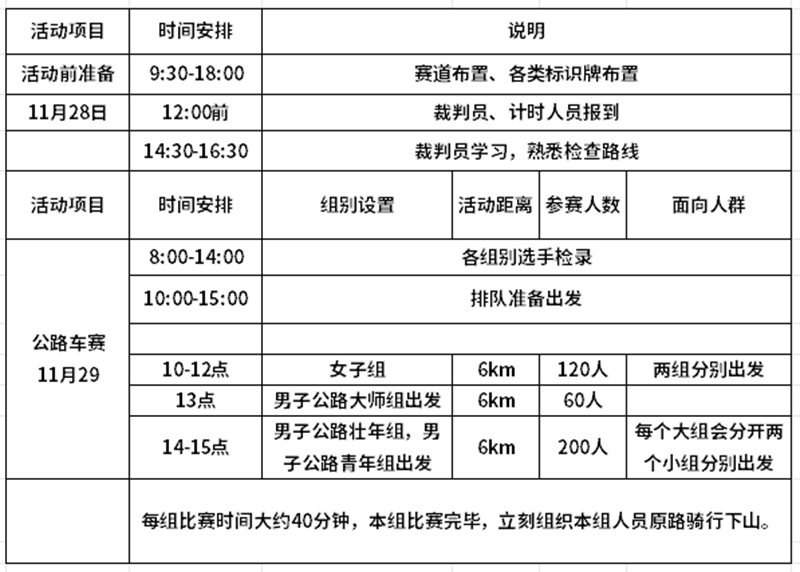 5) 比赛采用电子芯片计时系统,公路车赛关门时间为40分钟。被关门的参赛选手作未完赛处理,不予排名,总裁判长有权令其停止比赛。