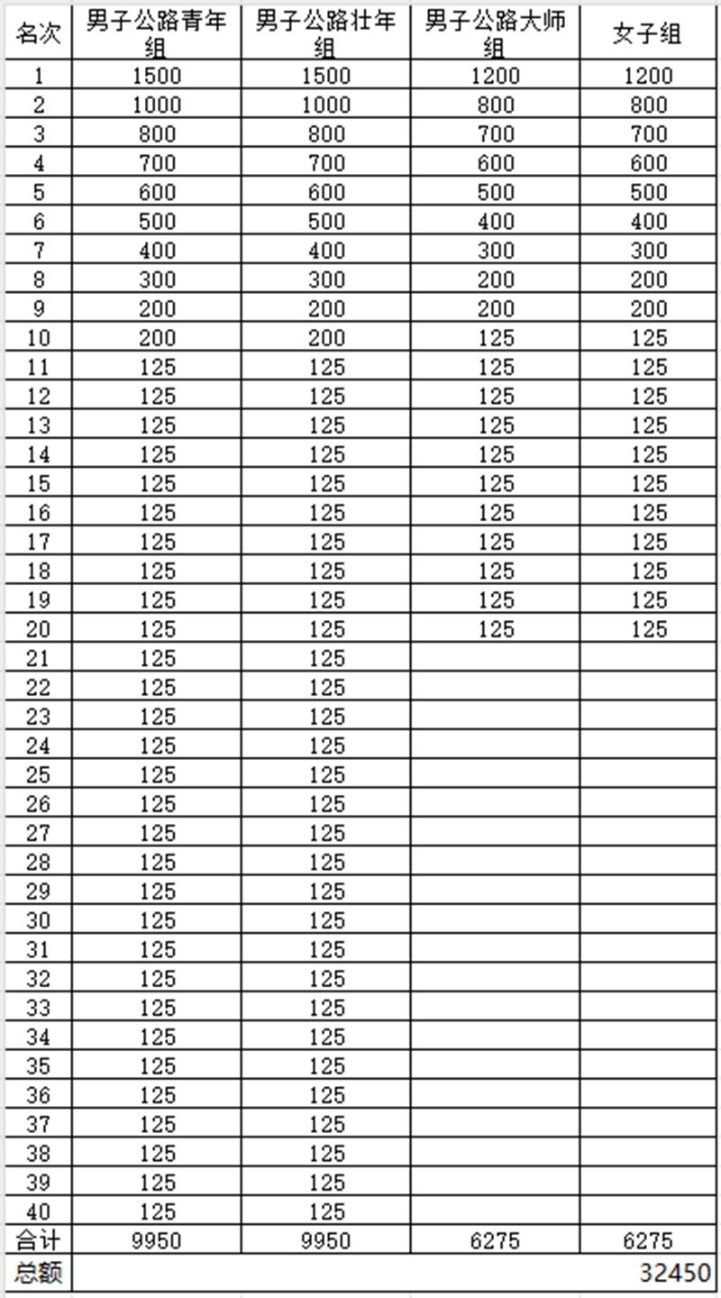 女子组:完成比赛,前20名参赛运动员给予相应的奖金奖励。(每组报名人数不足30人,含30,奖励前面名次15名,组别报名人数不足20人,本组取消)。