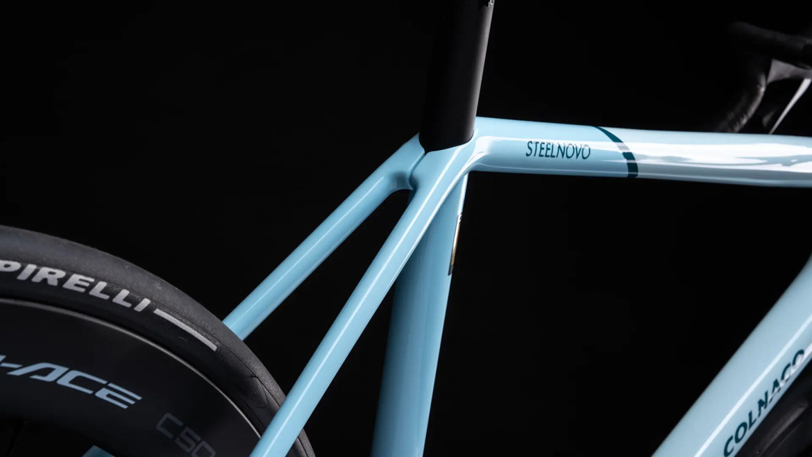 在碳纤维日渐平常的时候,梅花推出全内走钢架Steelnovo。得益于3D打印工艺,梅花用钢粉末打印出复杂的套管结构,从而实现钢架也能全内走。车架的管材采用顶级的Columbus钢管,确保了钢架的独有的韧性、舒适度和路感反馈。车架最大的胎容来到35mm,还是可以适应轻度的Gravel,并且回归了更加耐用的T47螺纹中轴,以及UDH尾勾。每一个车架都在梅花的意大利总部进行制造和涂装,说是为了保证顶级的工艺水平。除了最初的70周年银色纪念版后,梅花为常规量产版推出两种配色方案,分别是浅蓝色和淡橙色。车架组的售价为63000元,每年量产400台。