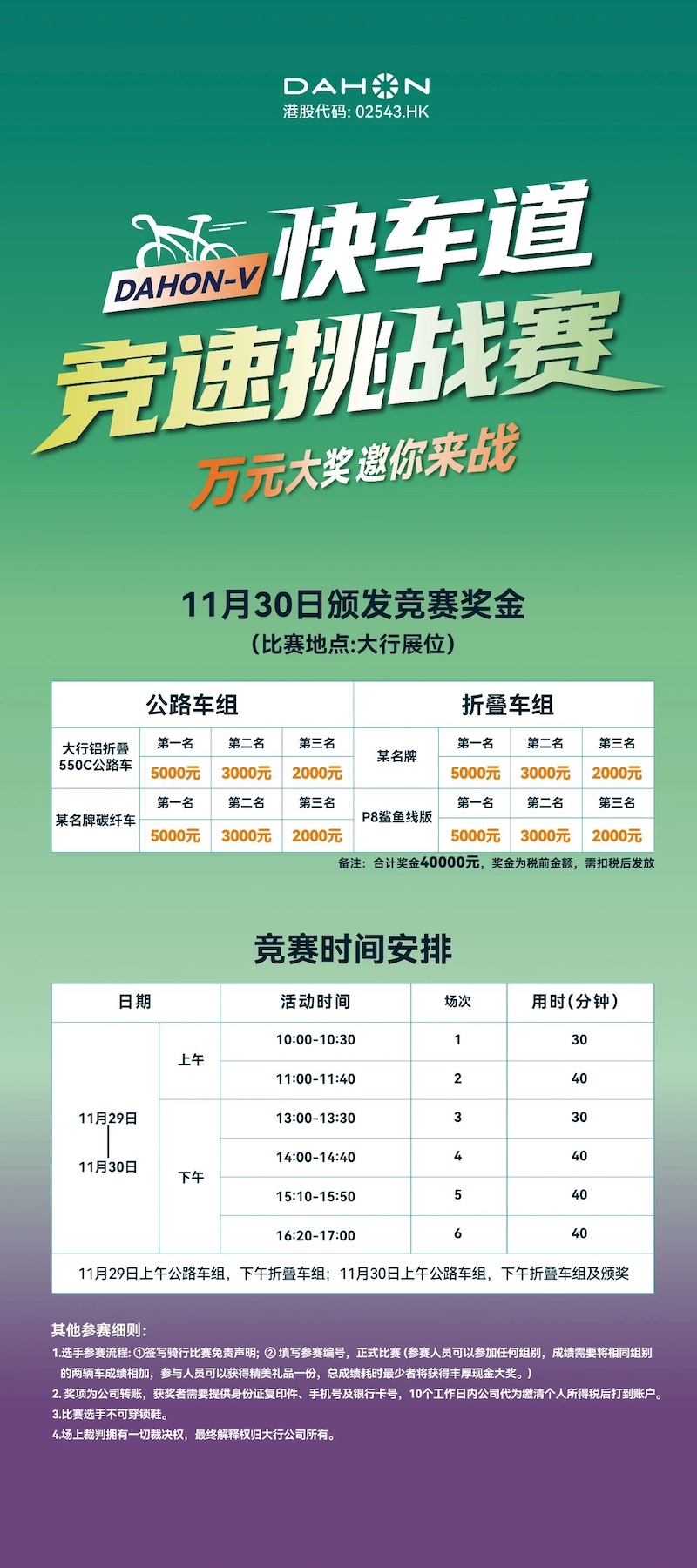 此次比赛共选用四款车型,大行铝550C折叠公路车将与某名牌碳纤车型一决高下,P8折叠车鲨鱼线版和某品牌三折车展开激烈角逐。参赛人员可自由参加任何组别,每组必须骑完两台车,最终以速度为基准评选获奖者。四辆车骑得最快的选手将荣获最终大奖,共计设置4个奖项,每个奖项奖金10000元(冠军5000元,亚军3000元,季军2000元),总计40000元(税前),比赛于11月30日下午现场颁奖,丰厚奖金等你来拿!