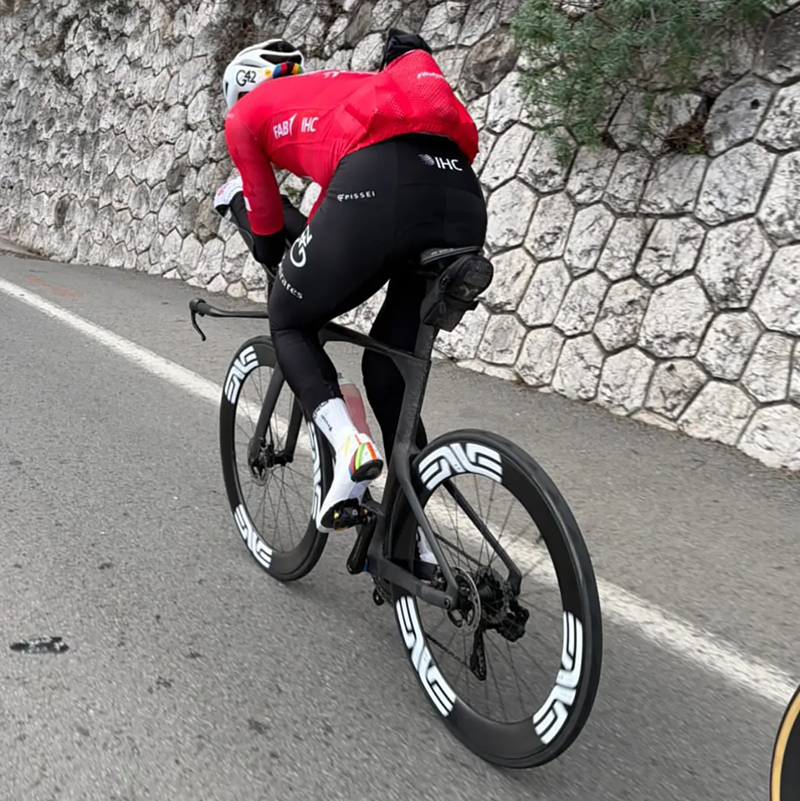 尽管未见明显品牌标识,但波加查似乎使用了可调节的ENVE气动延伸把与肘垫,而非去年环法其计时赛车上的一体式定制延伸把。泄露照片显示他搭配了ENVE SES 6.7轮组、3D打印Fizik坐垫及坐垫包。