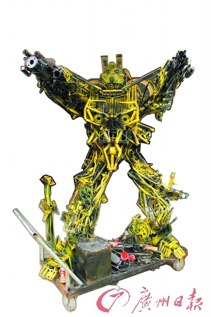 电影《变形金刚》中“大黄蜂”、“擎天柱”、“威震天”等“汽车人”模型让众多变形金刚迷们爱不释手。近日,一则“高埗芦村路口某间单车铺惊现变形金刚大黄蜂”的消息在微博上引起热议,不少网友纷纷转发评论称制作者“有才”、“乃东莞牛人”。记者日前找到该维修店,看到了这个巨型“大黄蜂”。