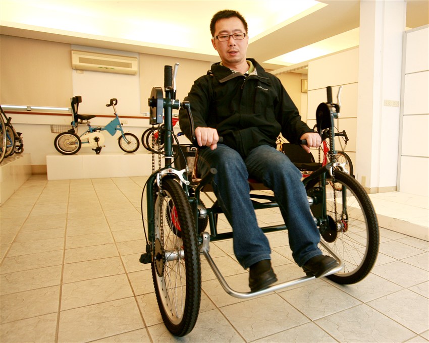 再往三楼走去,可说是重兵器区的特殊车展示区,有联合国下订单,专为依索比亚等战地用防地雷身障三轮车,具有钢板保护、屁股直接转向、手摇前后行动等便利性,折叠手摇三轮车、亲子四人协力车和2人协力车(2Rider)、划船车、高球脚踏车,以为脑麻儿童设计的复健车。