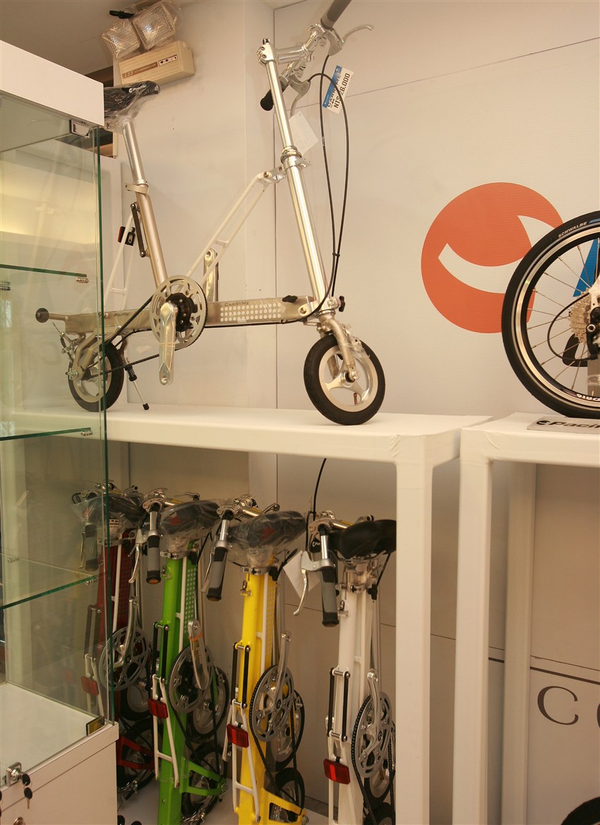 从一楼的溷合区走上二楼,则属于轻兵器区的通用车系,有来自日本订单,专为银发族设计具有辅助轮的车,甚至是各式可折叠的斜躺车、都市车,有铝合金、钛合金车身,甚至是稀土的钪合金,也有没有变速齿轮但可达14速的花鼓装置。