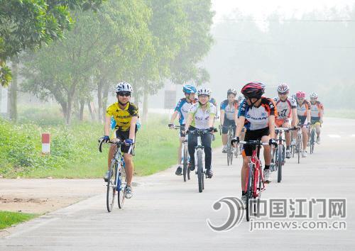 4月14日上午7时15分许,开平市赤水镇像以往的大多数日子一样,在清新的空气中,开始了新的一天。与以往不同的是,在当地镇府广场上,这里聚集了一群特殊的年轻人。他们身穿颜色各异的骑行服,头戴骑行帽,身边各自推着一辆专业配置的自行车。
