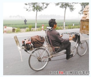5月1日上午,一辆后部装有螺旋桨推进装置的自行车,快速行驶在省道231线上,引来众多行人侧目。