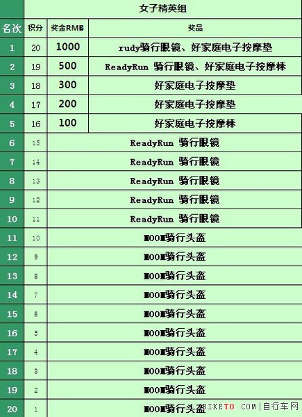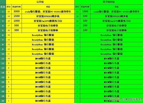 比赛为广大参加者提供了丰厚的奖品,凡参赛的选手均可获得由广州信良运动服装有限公司提供的吸汗排汗文化纪念衫一件及好家庭大礼包一份。公开组冠军获得rudy骑行眼镜及好家庭FC-91551健身单车。