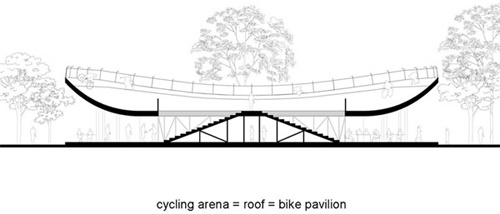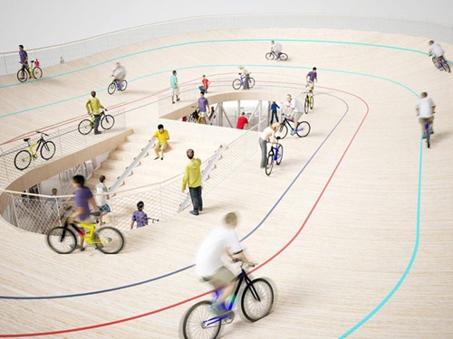酷骑自行车馆从外面看起来像个大盘子,屋顶是个椭圆形的赛道,它主要是靠在“盘子”底部的一圈玻璃墙来承重。