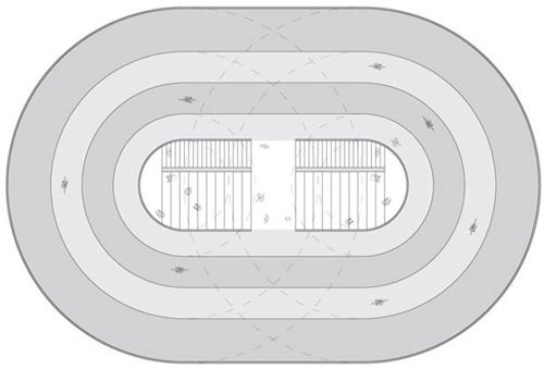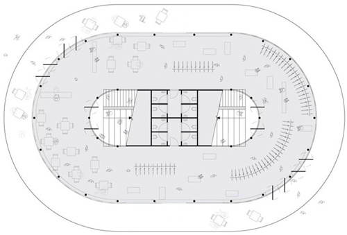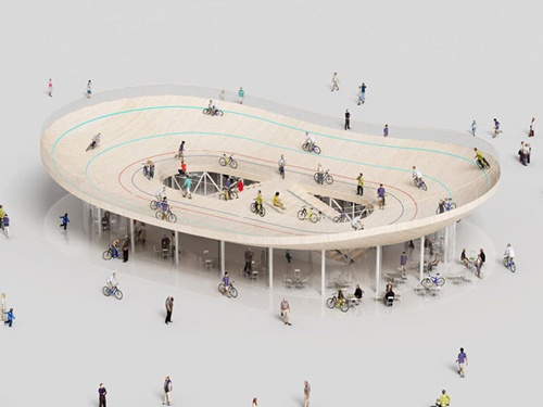 玻璃墙与“盘子”形成的封闭空间实际上是个独具特色的自行车主题咖啡厅,人们从赛场上下来之后,可以通过“盘子”中央所连通的楼梯直接到达咖啡厅进行休息。洗手间隐藏在楼梯的下方。