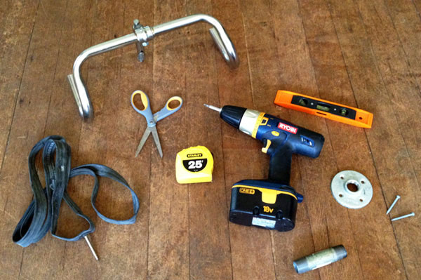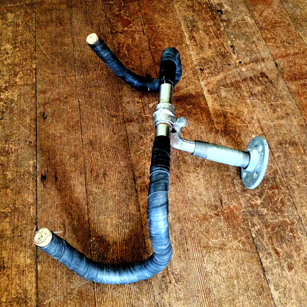 首先你需要一个旧的弯把把手,一根能帮把手定位的金属管及固定底座,这些材料都可以在五金行找到。接着再把单车把手和钢铁管锁紧,假如你的把手已经有保护的胶条,那么就不需要跟 Kyle 一样再包覆胶条(实际上 Kyle 用的是一条旧轮胎),这个动作主要是保护单车框架不被把手刮伤。